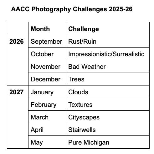 For each meeting, a monthly theme or assignment is named with the goal of challenging members to create new and compelling images. On the first Tuesday meeting of each month, projected digital images are presented. On the third Tuesday, printed images are displayed and presented. Submission guidelines are provided below.